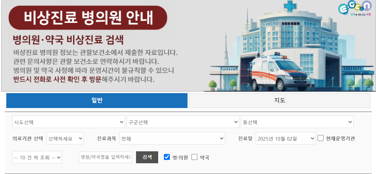 보건복지부에서 제공하는 응급의료포털 E-Gen은 설 연휴 기간 동안 운영하는 병원 정보를 실시간으로 제공해 주는 홈페이지입니다! 지역, 의료기관 종류, 진료과목, 진료일 등을 선택하면 비상 진료 병원의 정보가 표시됩니다. 진료시간이 변동될 수 있기 때문에 방문 전 반드시 전화로 진료시간을 확인 한 후에 방문해 주세요!